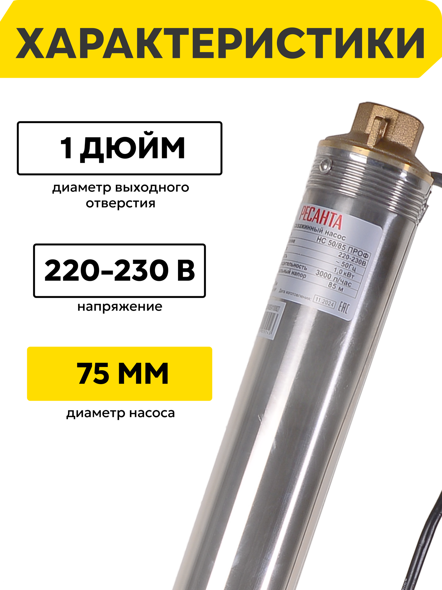 Скважинный насос НС 50/85 (d.75 mm, кабель 50 м) Ресанта, центробежный 1000Вт информация: