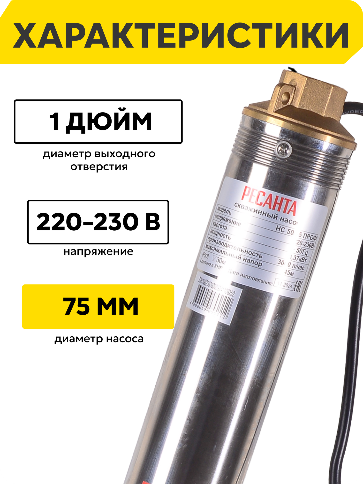 Насос Ресанта НС 50/45, погружной, нержавеющая сталь, IPX8, кабель 20м, 370 Вт информация: