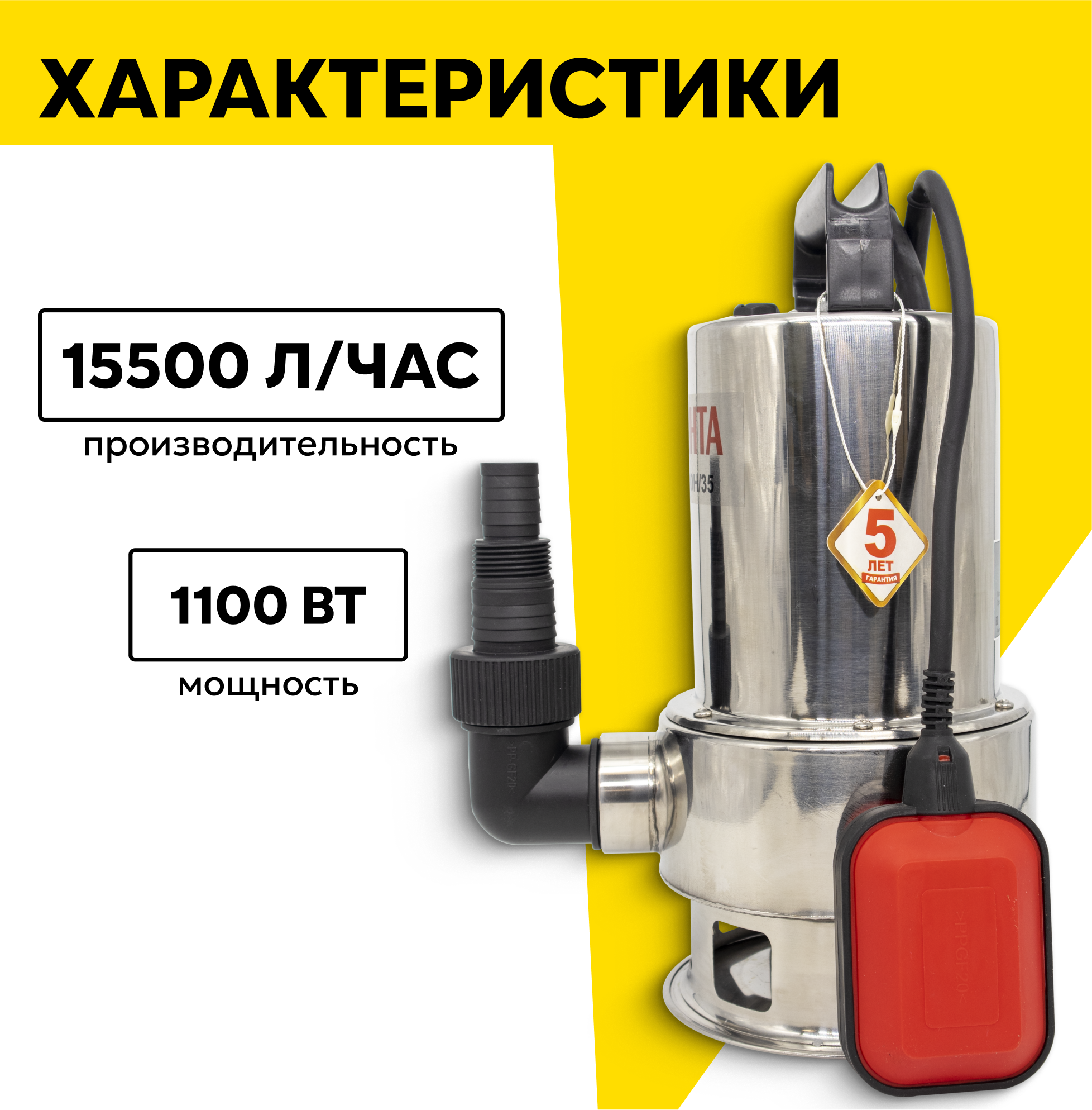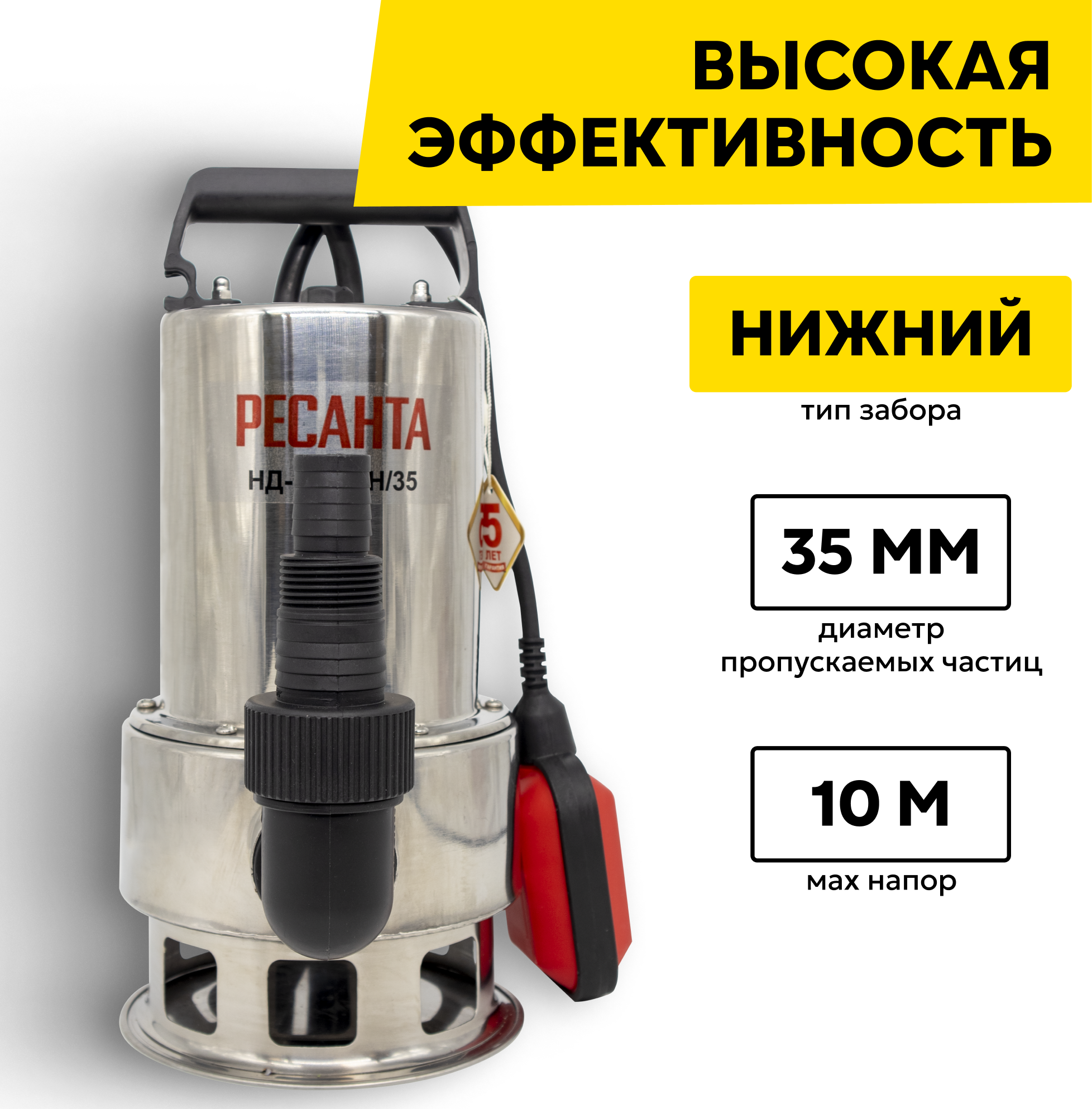 Дренажный насос Ресанта НД-15500Н/35, 1100 Вт, макс. напор – 10 м, 15500 л/час, для грязной воды информация: