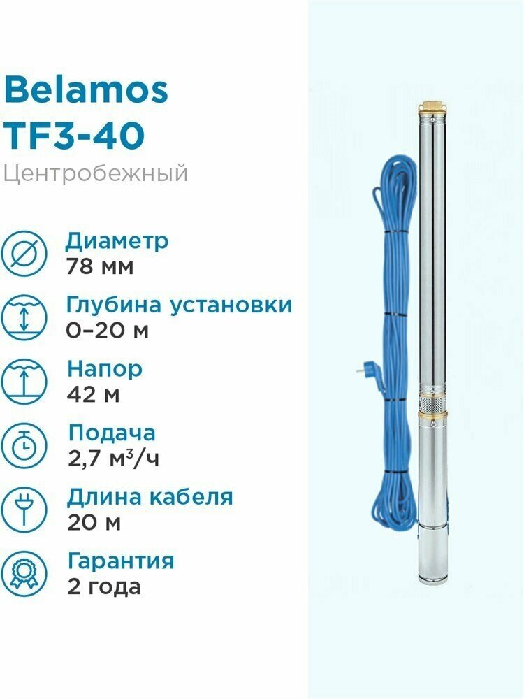 Скважинный насос Беламос ТФ3-40/2.7, кабель 20 м, диаметр 75 мм информация: