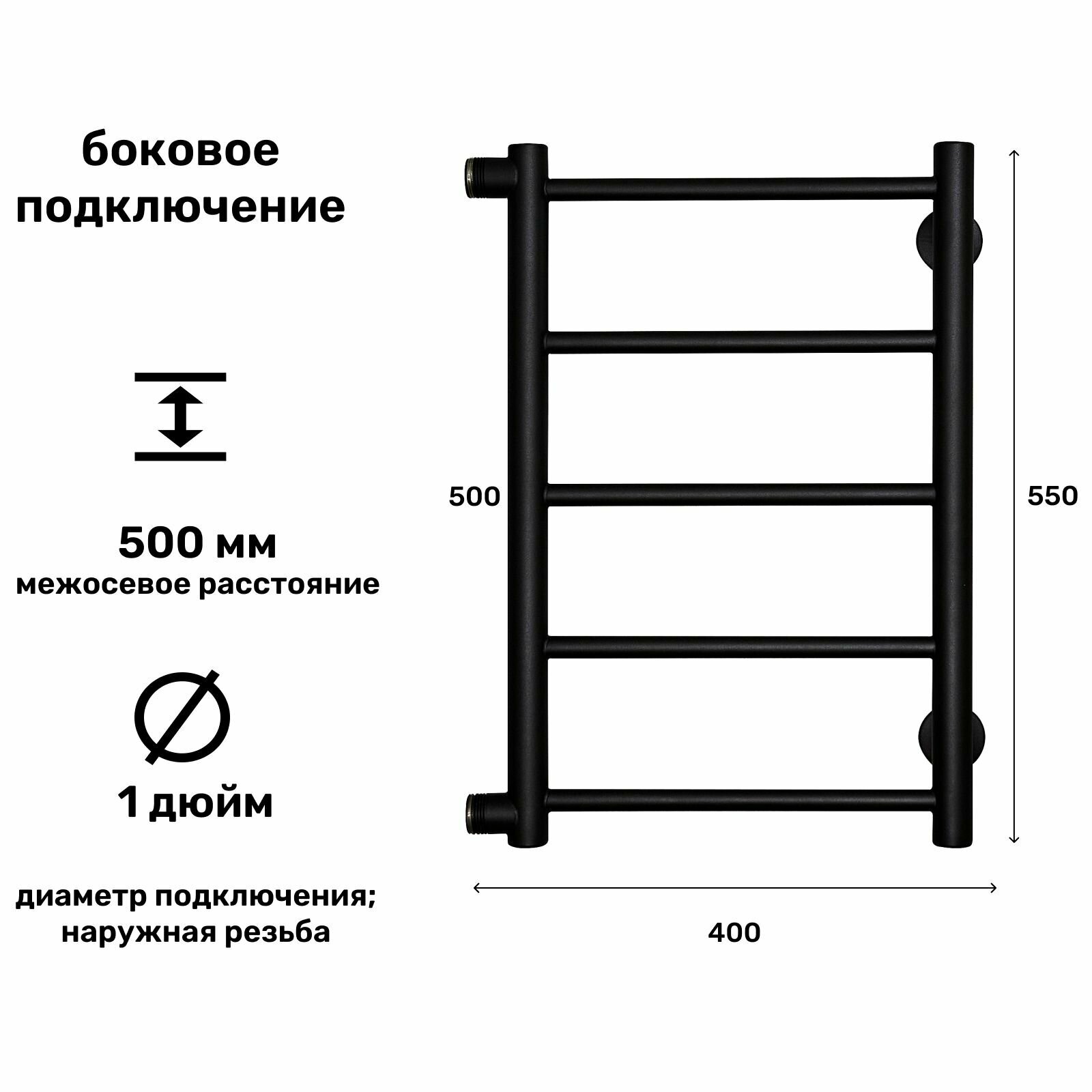 Полотенцесушитель водяной Лесенка Прямая 500х400 боковое подключение 1 дюйм черный матовый информация:
