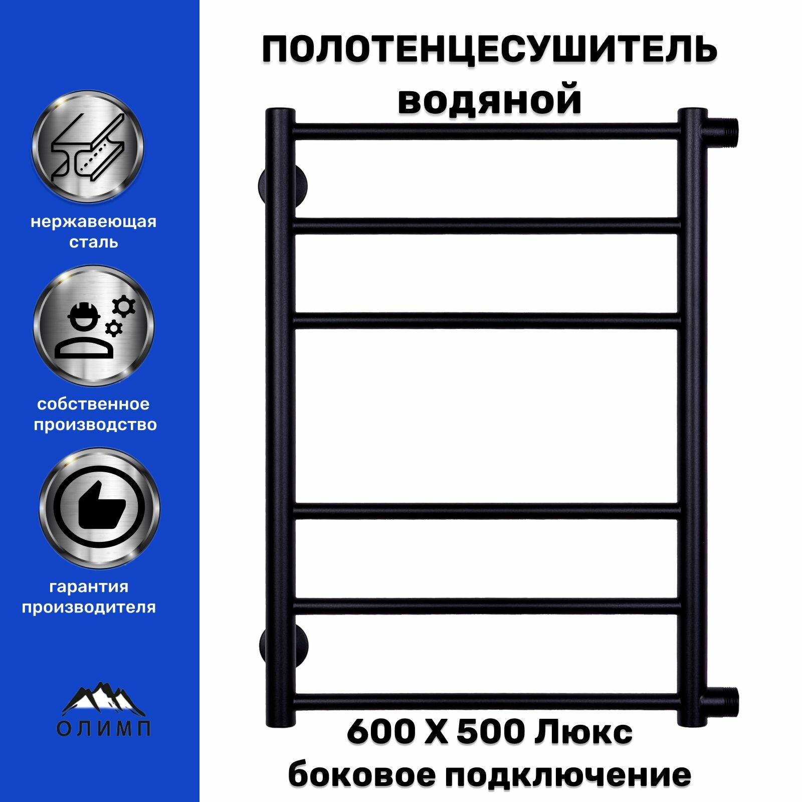Отзывы на Полотенцесушитель Лесенка Прямая Люкс 600х500 черный матовый боковое подключение 1 дюйм