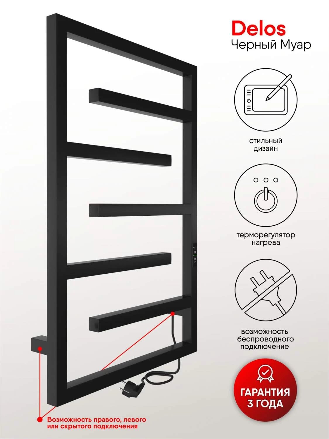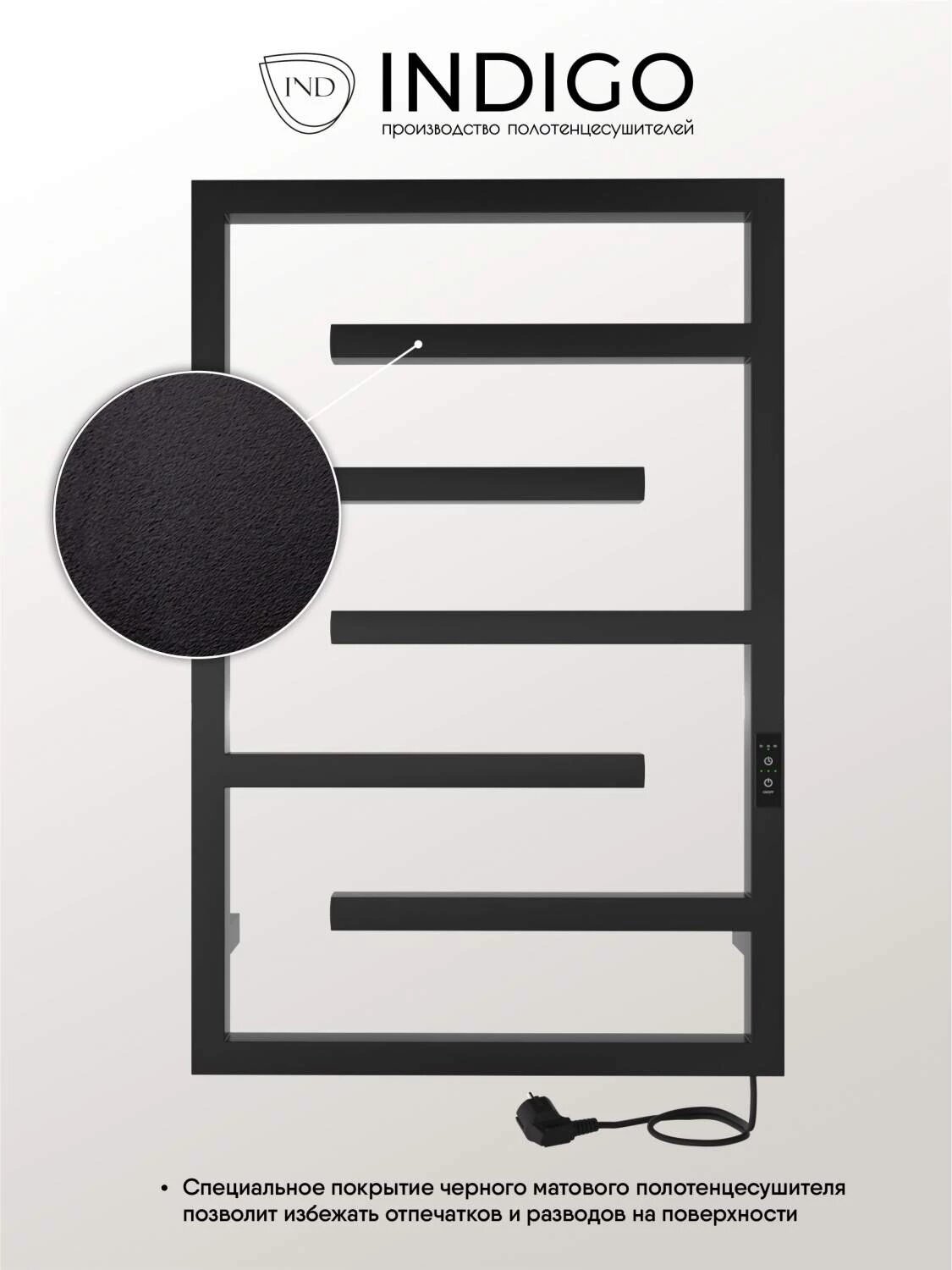 Полотенцесушитель электрический Delos 70/40 (таймер, скрытый монтаж, универсальное подключение, Черный муар) INDIGO