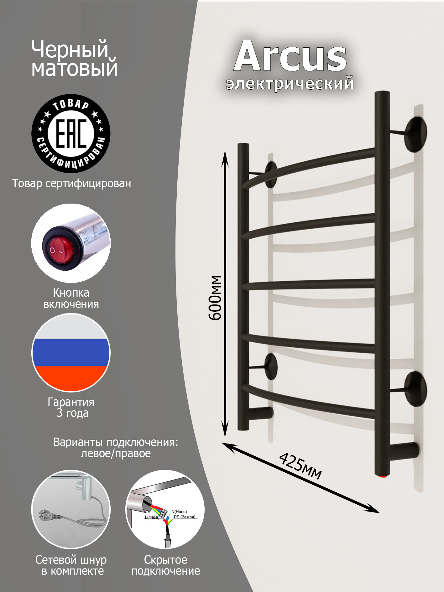 Черный полотенцесушитель электрический arcus 60 нержавеющая сталь информация:
