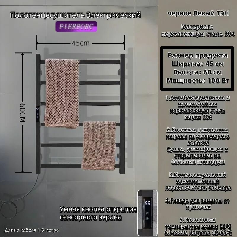10 цен на Полотенцесушитель электрический с терморегулятором 600х450х120 форма Лесенка, 6-перекладин, Правый ТЭН, скрытое подключение, черное