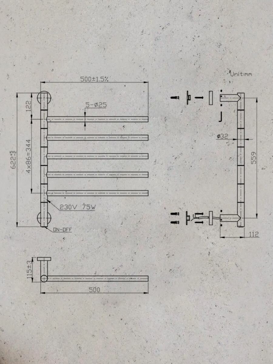 TERMINUS Полотенцесушитель электрический Terminus Хендрикс П6 500x596, ТЭН HT-1 300W, левый/правый