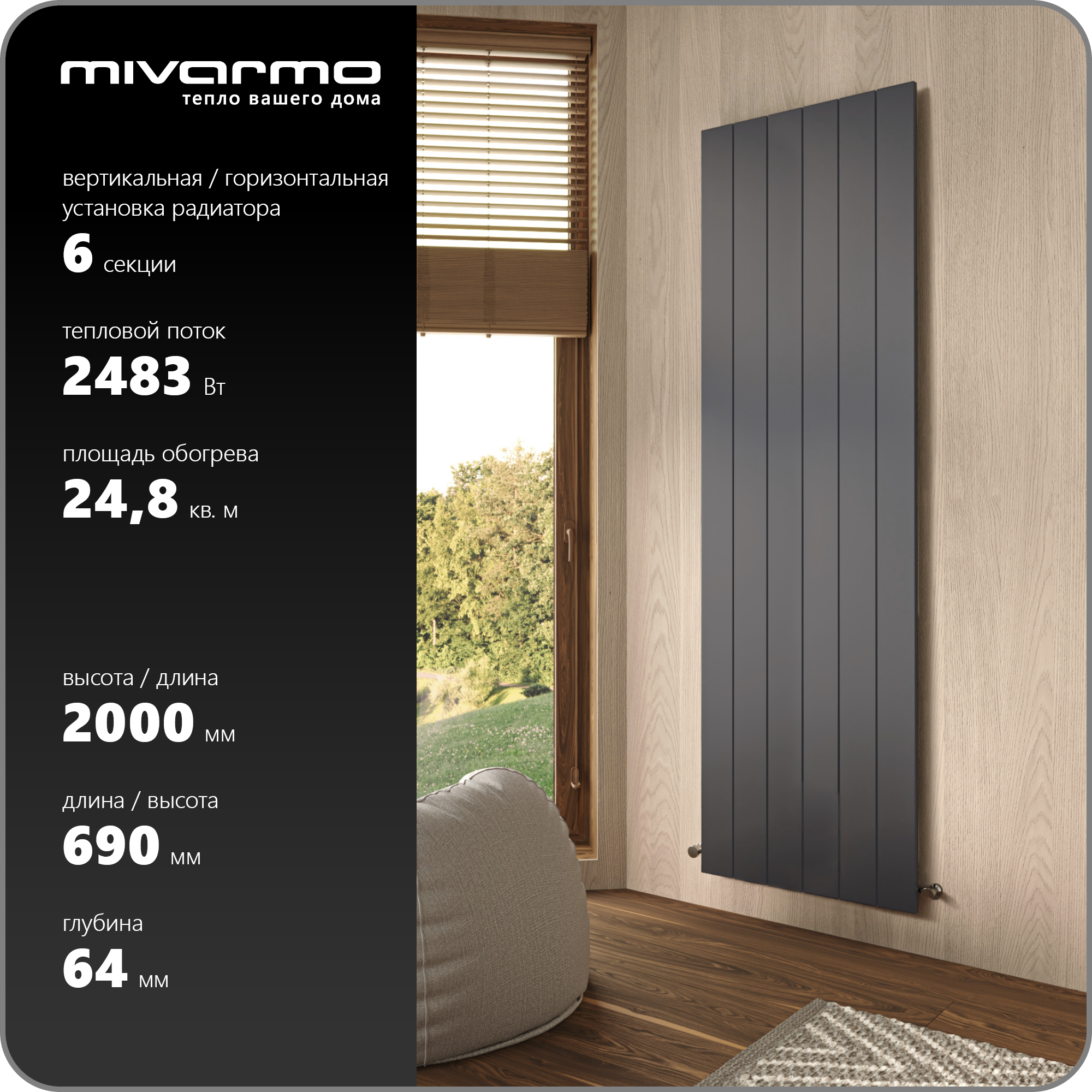 Отзывы на Секционный радиатор отопления Mivarmo 6 секций, горизонтальное/вертикальное подключение 200 см (графитовый муар)