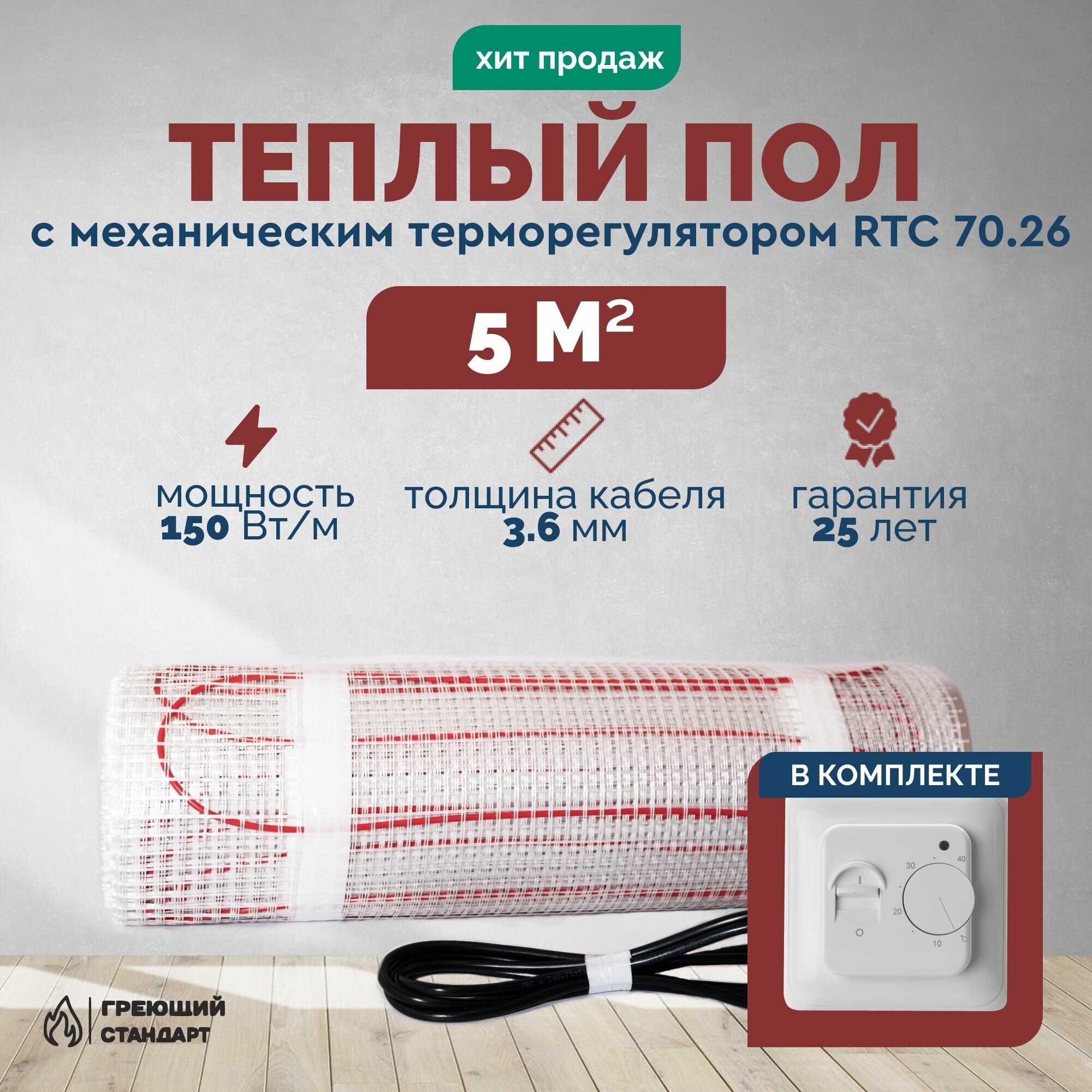 Теплый пол электрический 5 м2 150 Вт под плитку с механическим терморегулятором RTC 70.26 (нагревательный мат) информация: