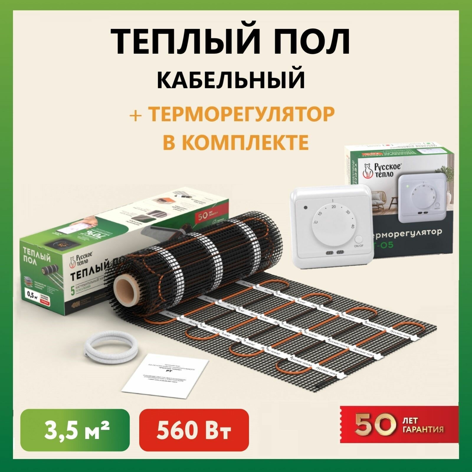 Теплый пол электрический под плитку нагревательный мат Русское тепло 3.5 кв. м, в комплекте с терморегулятором РТ-05 (3.5 кВт.). информация:
