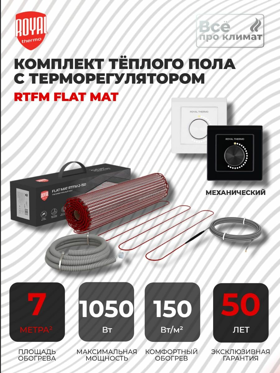 Теплый пол электрический мат под плитку Royal Thermo RTFM 2-150-7 с механическим терморегулятором Onix RTO-16, комплект информация: