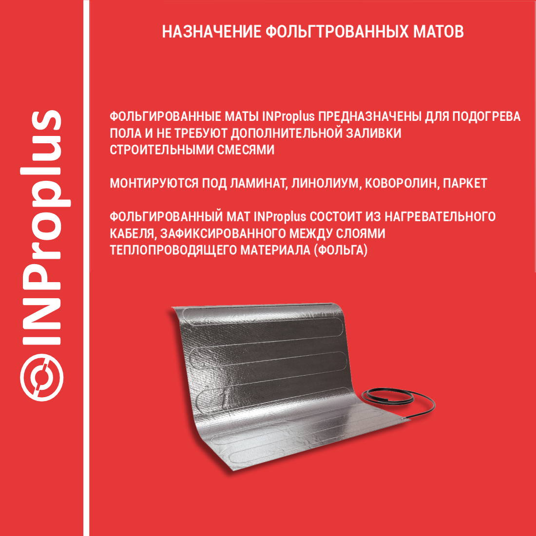 Фольгированный, алюминиевый нагревательный мат INPro+, теплый пол 0,5 кв. м. - 75Вт информация: