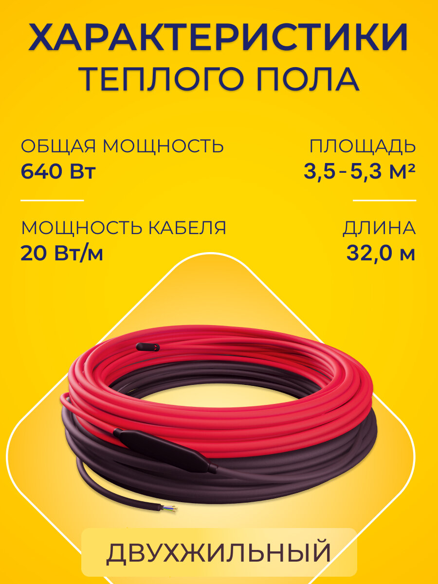 Теплый пол в стяжку, площадь 3.5-5.3 м2, мощность системы 640 Вт, с программируемым сенсорным терморегулятором информация: