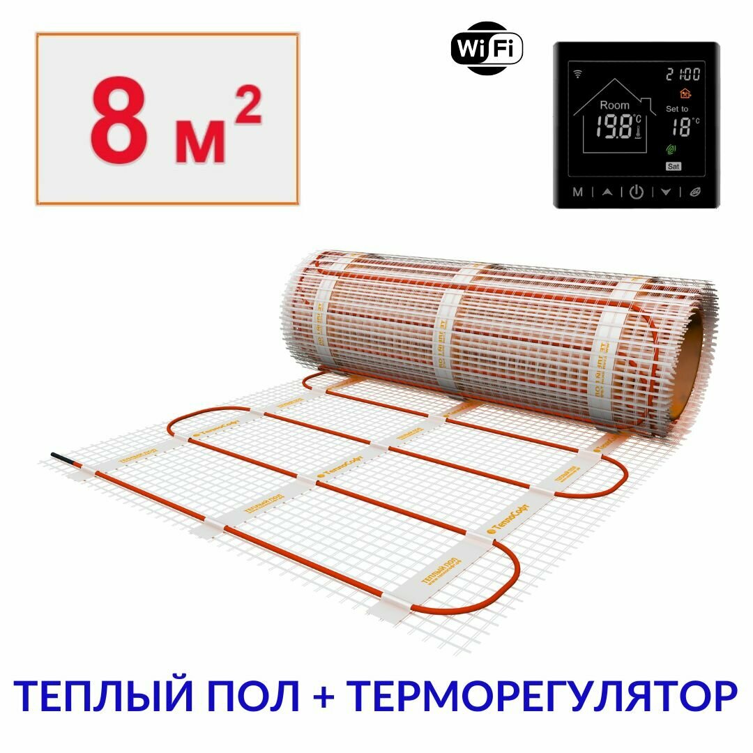 Теплый пол электрический под плитку 8 м2 с черным умным wi-fi сенсорным терморегулятором. Нагревательный мат 8м. кв. информация: