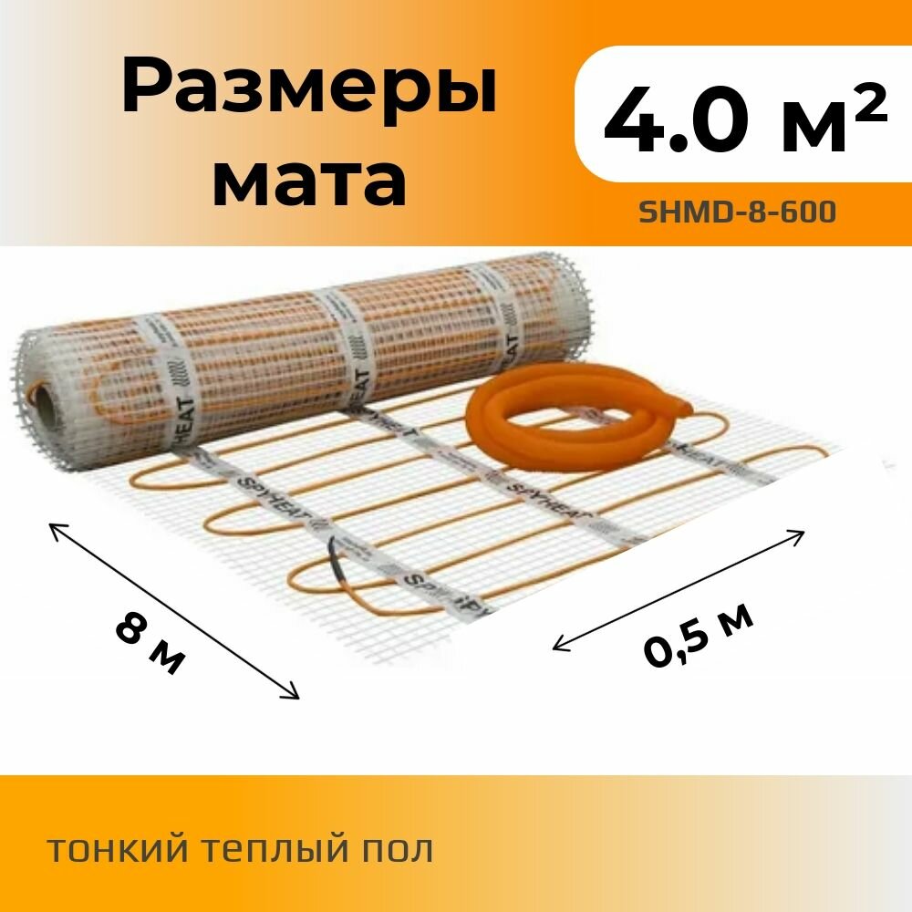 4,0 м2 Теплый пол без стяжки под плитку нагревательный мат SpyHeat SHMD-8-600 Вт с механическим терморегулятором информация: