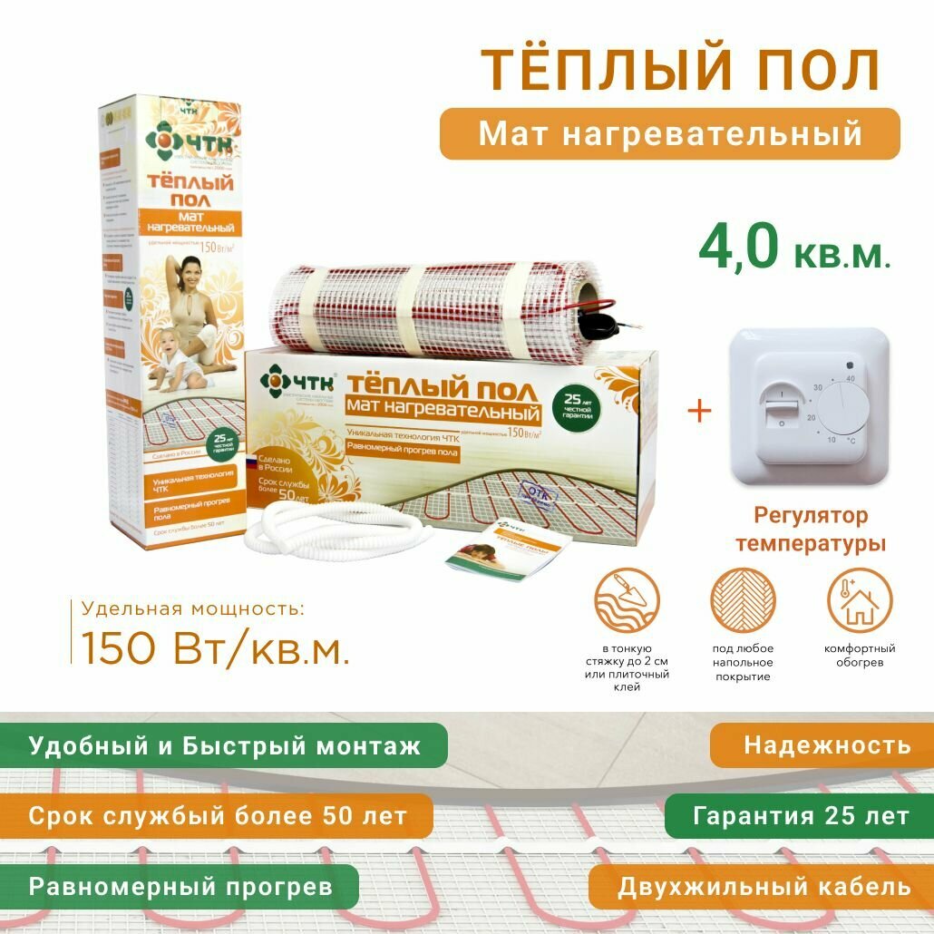 Теплый пол под кафель 4 м2, мощность 600 Вт, мат нагревательный двухжильный, с терморегулятором информация: