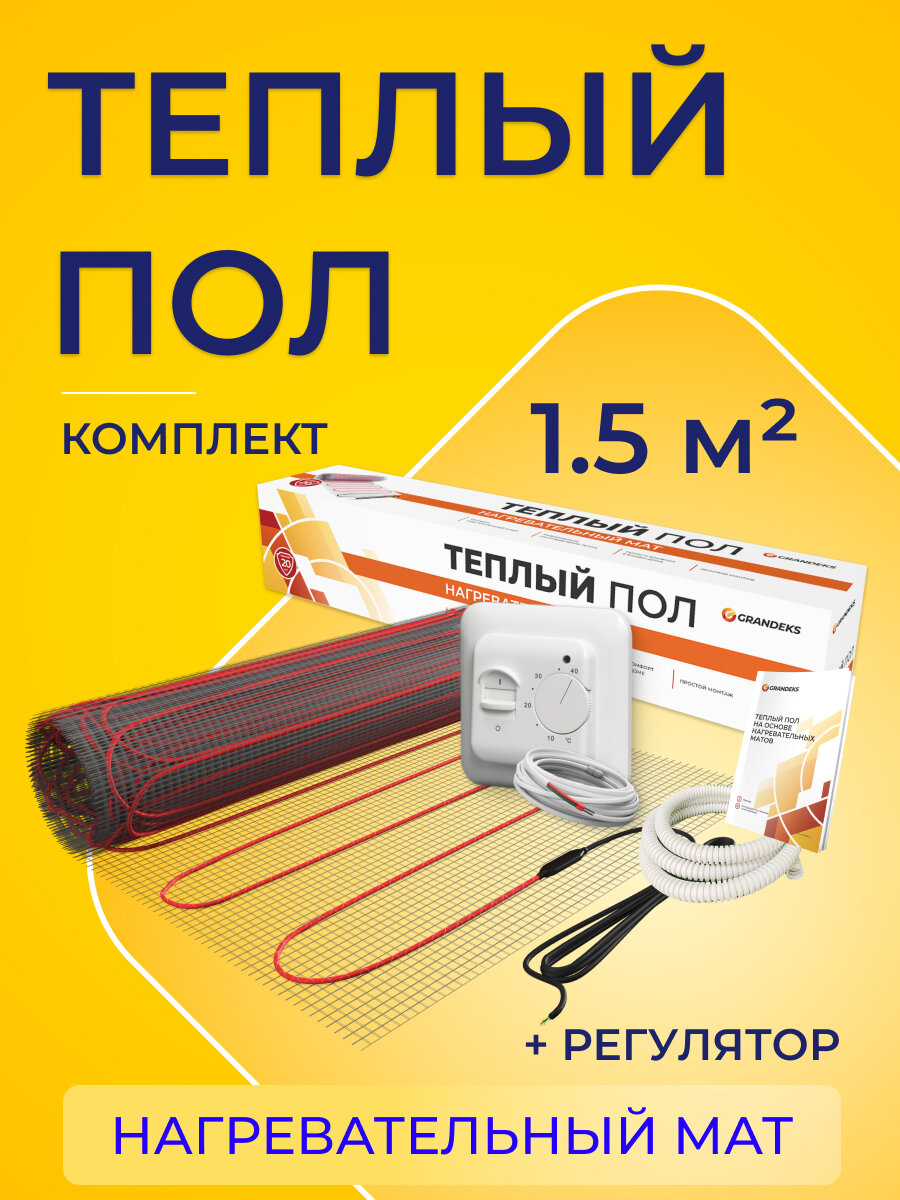 Теплый пол тонкий под кафель Grandeks 1 кв м, нагревательный мат двухжильный, терморегулятор в комплекте 3 426 ₽