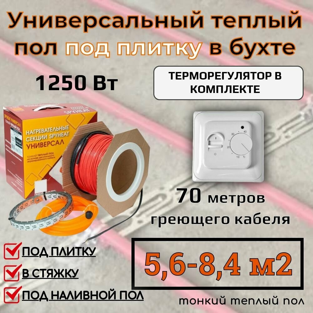 (5,6-8,4 м2) Тонкий теплый пол на катушке под плитку, наливной пол и на ЦСП (SHFD-18-1250 Вт) 70 метров с механическим терморегулятором информация: