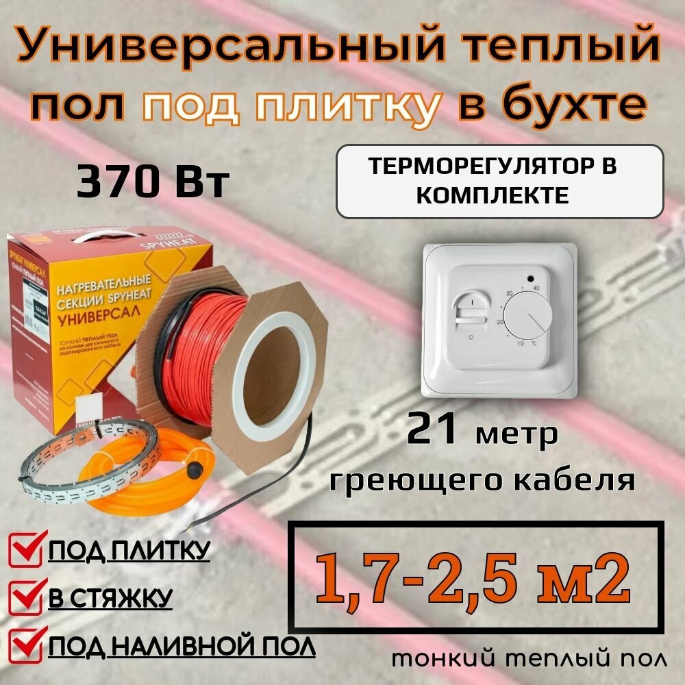 (1,7-2,5 м2) Тонкий теплый пол на катушке под плитку, наливной пол и на ЦСП (SHFD-18-370 Вт) 21 метр с механическим терморегулятором информация: