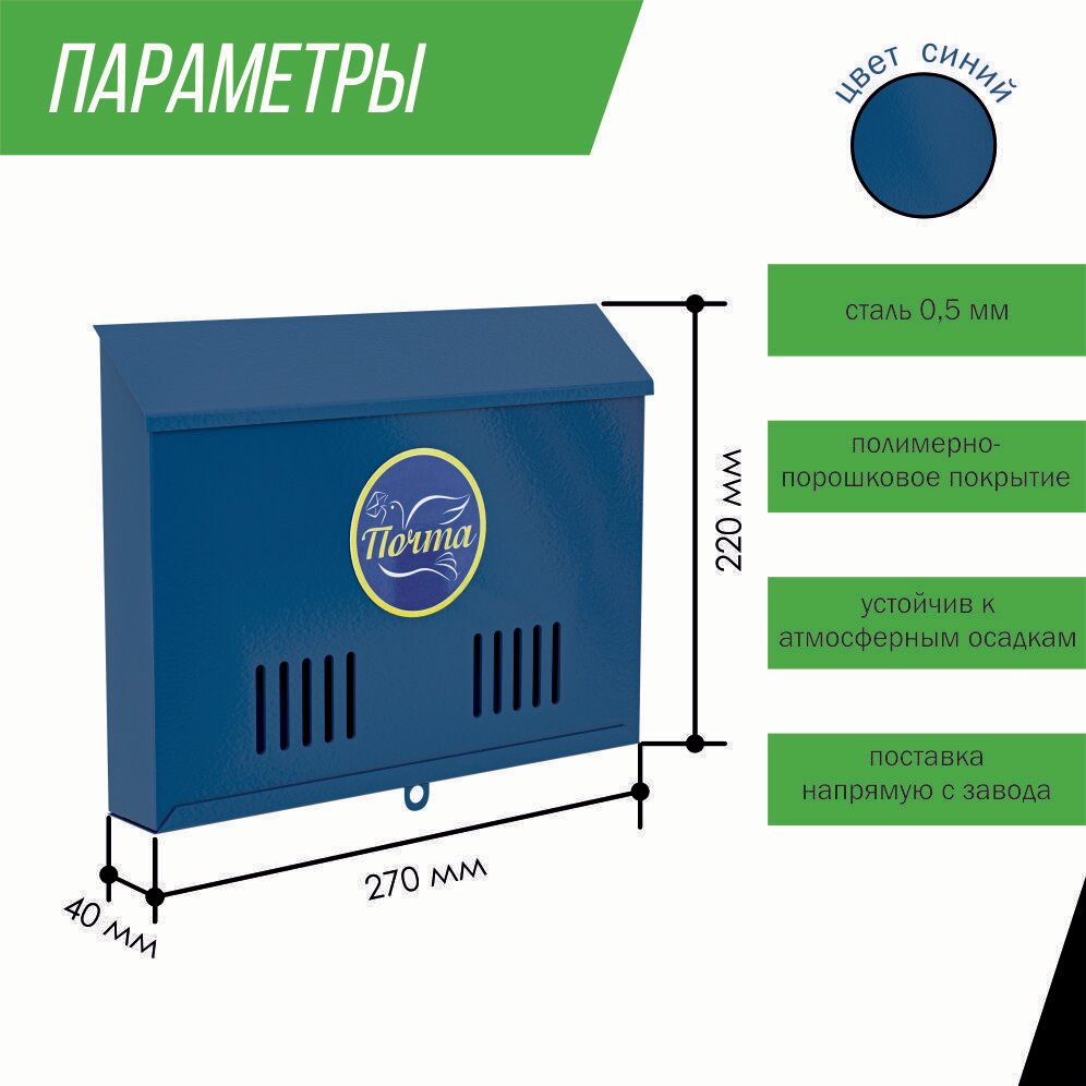 Почтовый ящик уличный без замка широкий с петлей 22х27х4 см (синий); МетМастер информация: