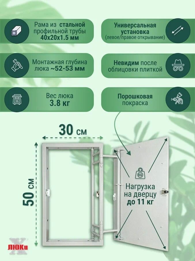 Люк ревизионный под плитку Шаркон 30*50 см, сантехнический, стальной, настенный, нажимной, люк невидимка информация: