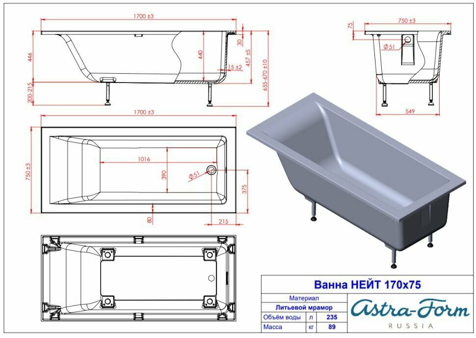 Ванна из литьевого мрамора Astra-Form Нейт 165х75 см (белая, глянцевая) информация: