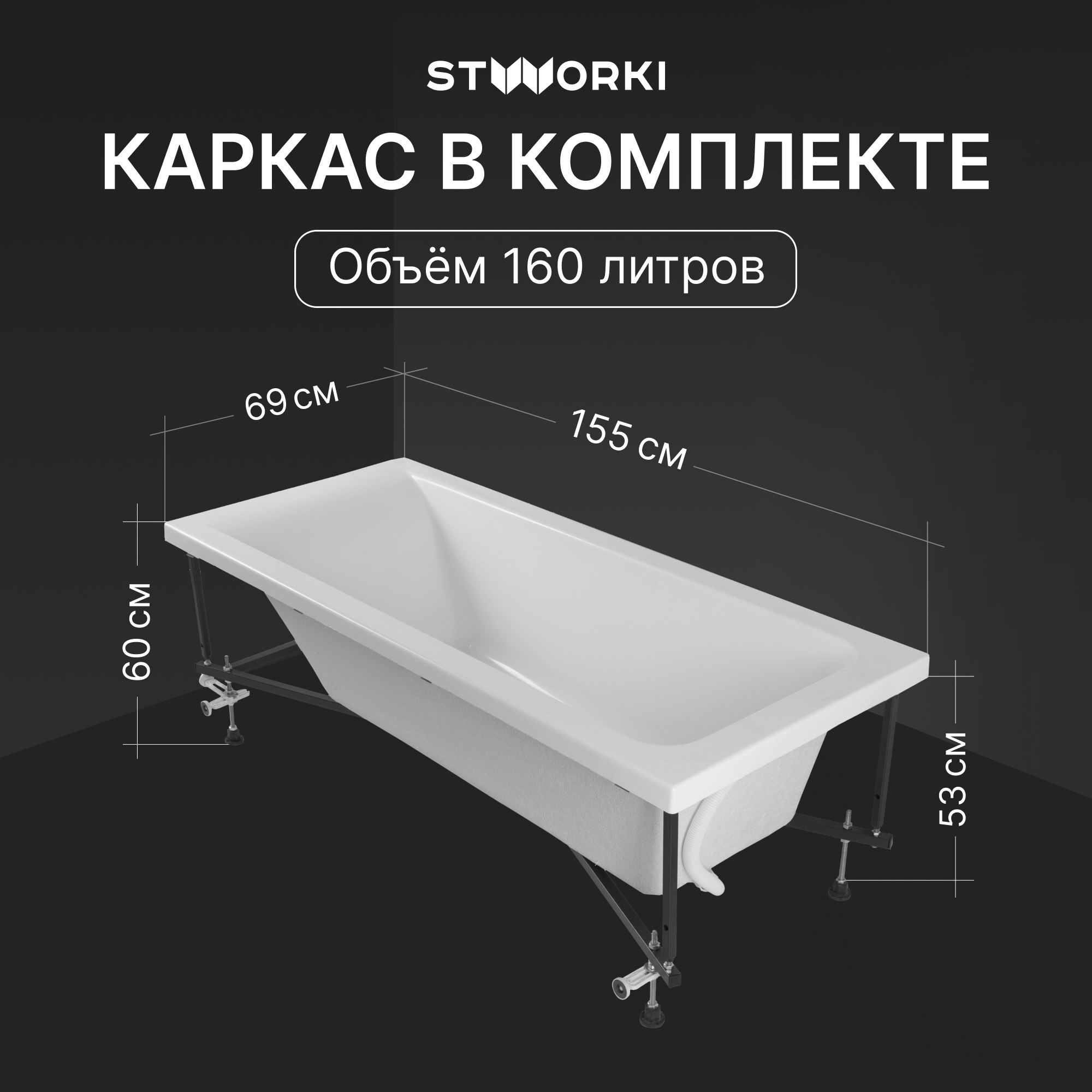 Акриловая ванна STWORKI Стокгольм 155x70 см, встраиваемая, белая, с каркасом информация: