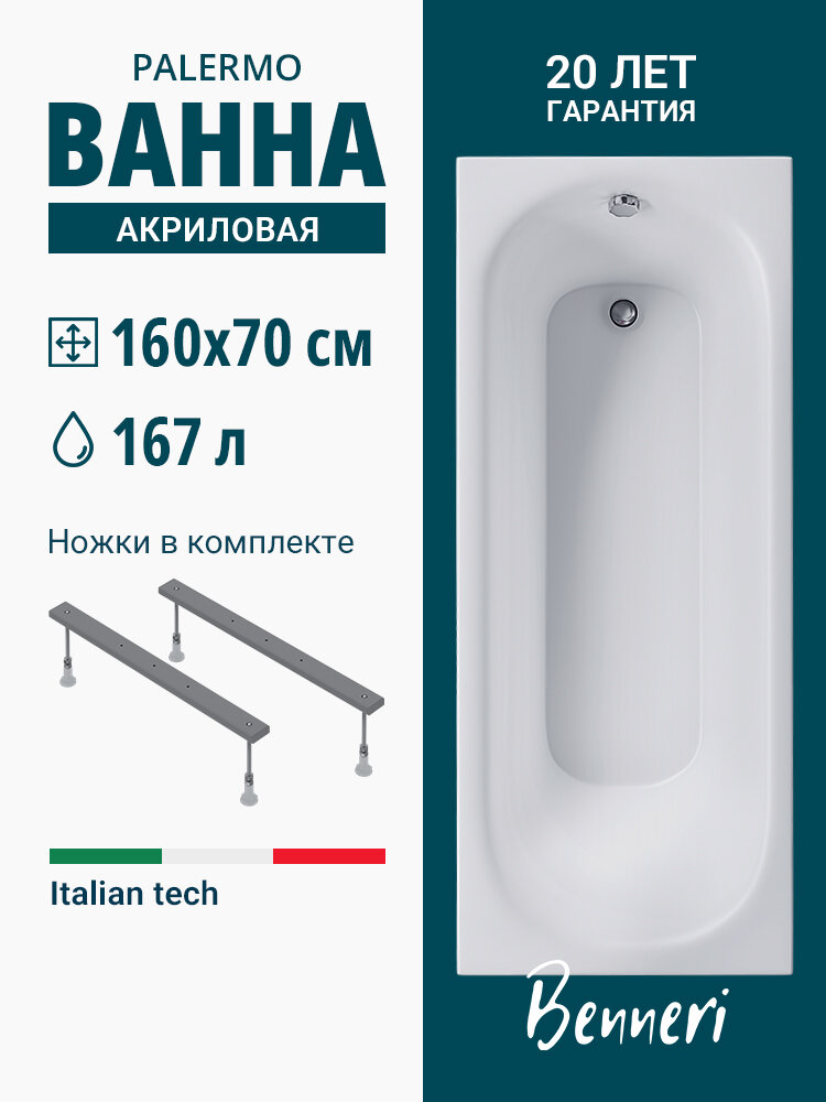 Ванна прямоугольная акриловая Benneri Palermo 170x70, в комплекте с ножками 9 821 ₽