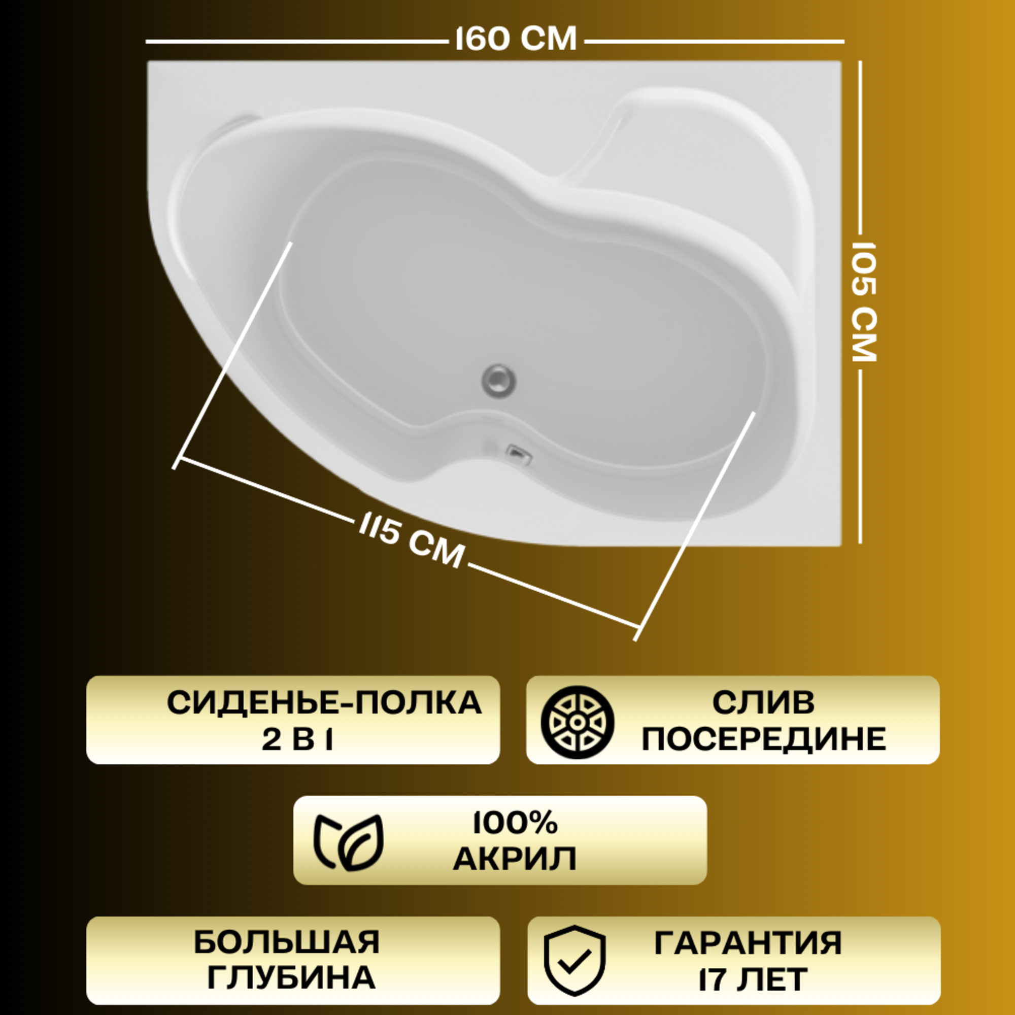Ванна акриловая 160х105 см AURA комплект 4в1: Ванна правосторонняя, фронтальная панель, рама, слив-перелив 01ау1610пкп информация: