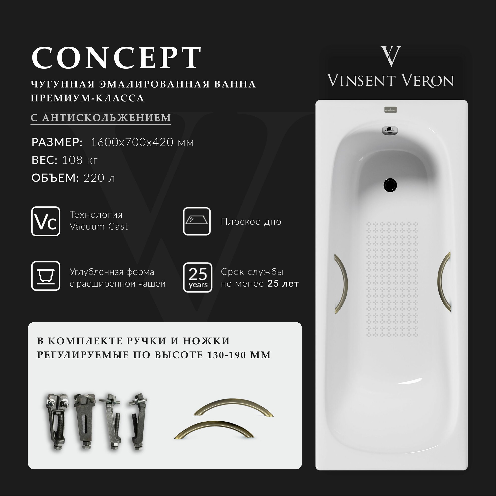 Чугунная ванна Vinsent Veron Concept 160x70x42 с антискольжением и дугообразными бронзовыми ручками информация: