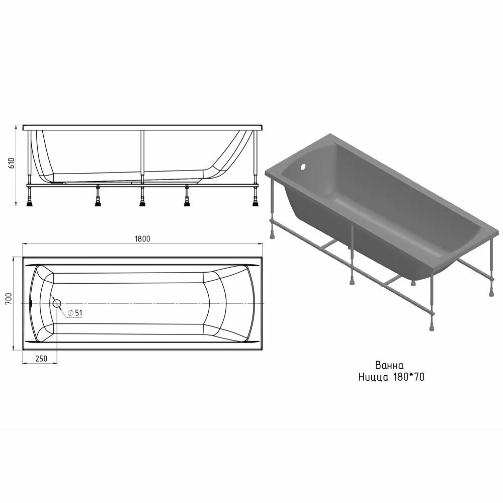 Ванна 100Acryl "Ницца", акрил, 180х70 см, противоскользящее дно, регулируемые ножки информация: