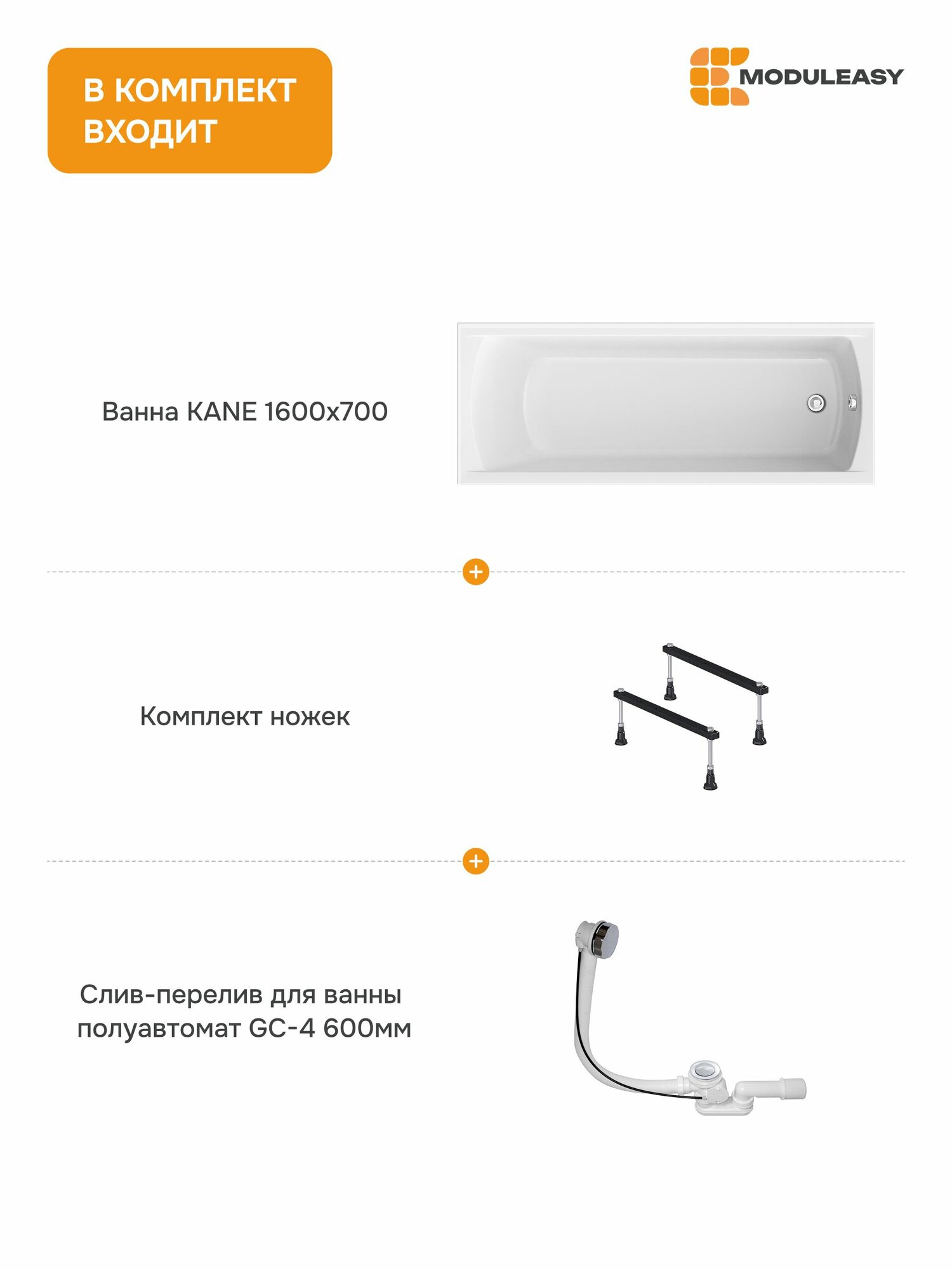 Ванна акриловая 160х70 см KANE MODULEASY в комплекте 3в1: Прямоугольная ванна, ножки, слив-перелив 01кейн1670кс1 информация: