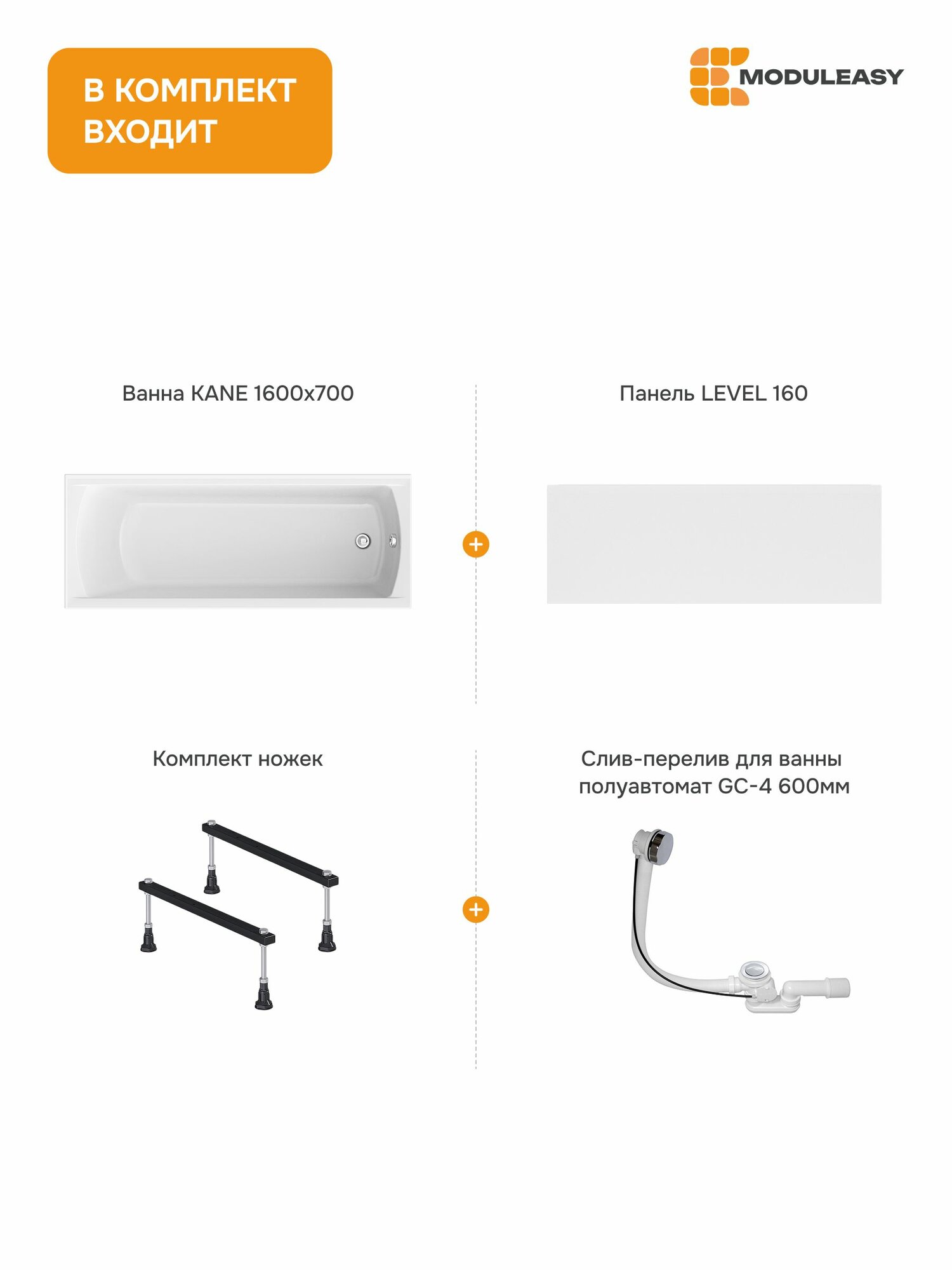 Ванна акриловая 160х70 см KANE MODULEASY в комплекте 4в1: Прямоугольная ванна, фронтальная панель, стальные ножки, слив-перелив 01кейн1670кс1+ информация:
