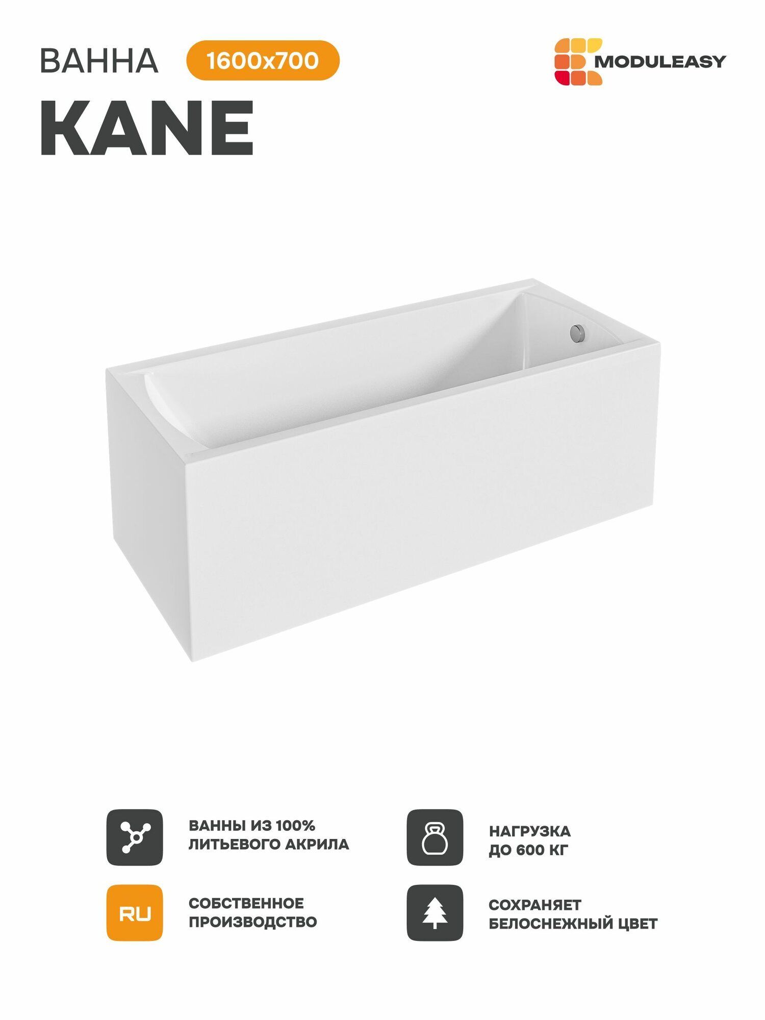 Отзывы на Ванна акриловая 160х70 см KANE MODULEASY в комплекте 4в1: Прямоугольная ванна, фронтальная панель, стальная рама, слив-перелив 01кейн1670кп