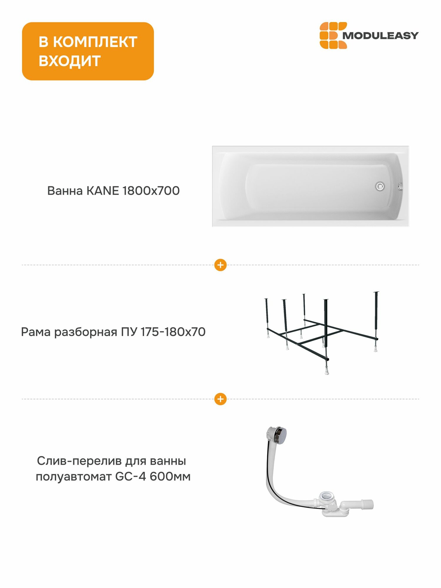Отзывы на Ванна акриловая 180х70 см KANE MODULEASY в комплекте 3в1: Прямоугольная ванна, стальная рама, слив-перелив 01кейн1870кс2+