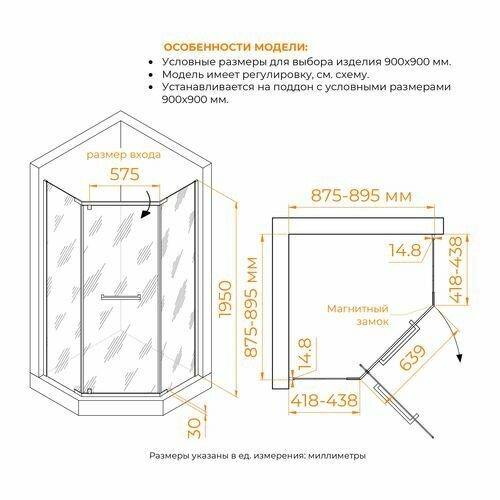 Душевой уголок трапеция RGW PA-83 90x90х195см. Дверь распашная, цвет Хром, стекло закаленное прозрачное 6мм. Без поддона. 78088399-11 информация: