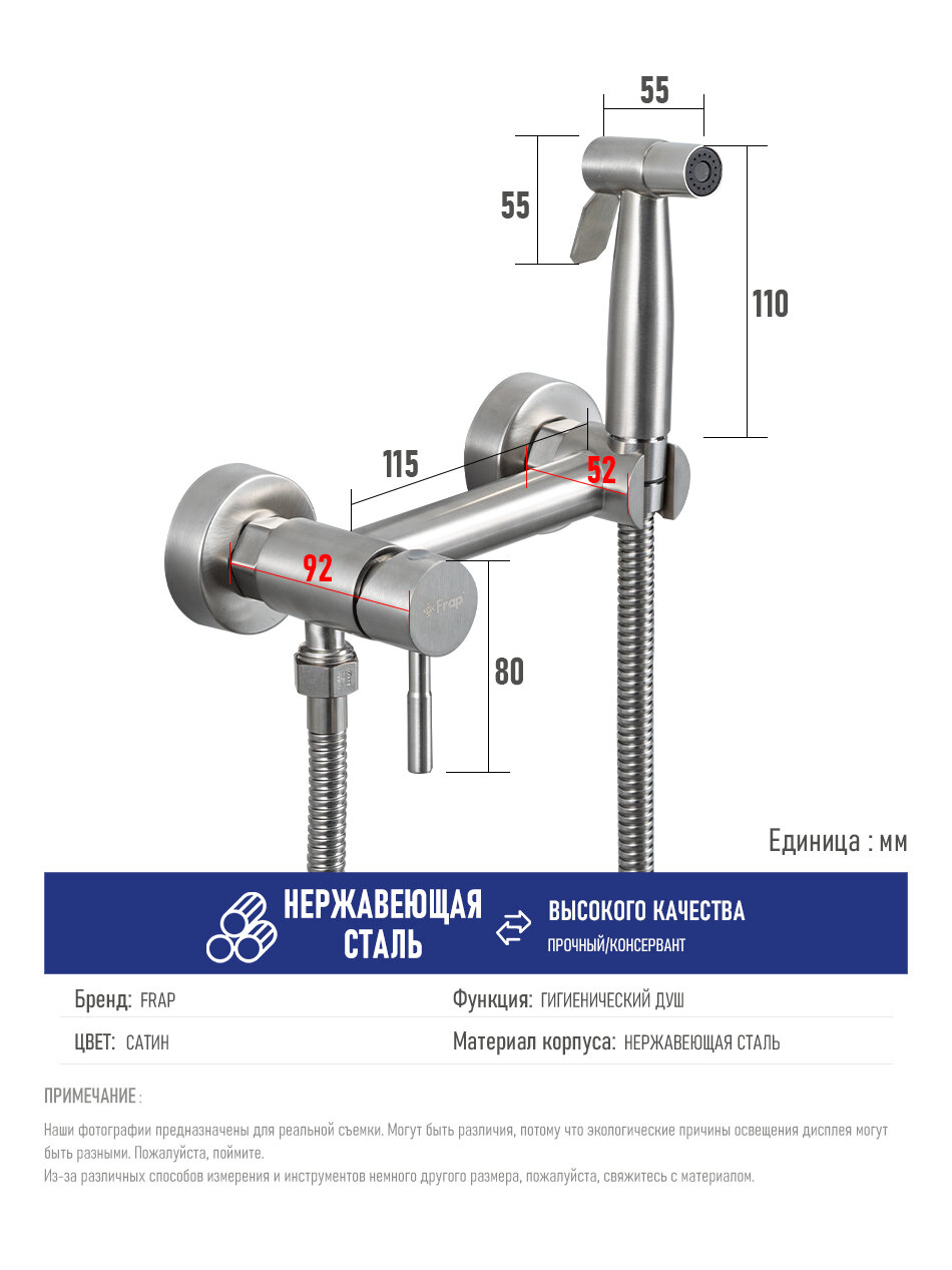 Гигиенический смеситель с душем на биде Frap, сатин, нержавеющая сталь информация: