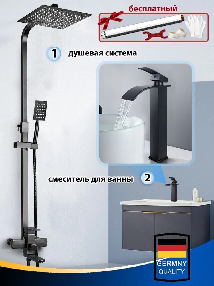 Душевая система с тропическим душем, и смеситель для ванны , Плюс штанга для душа, 3 В 1, черный информация: