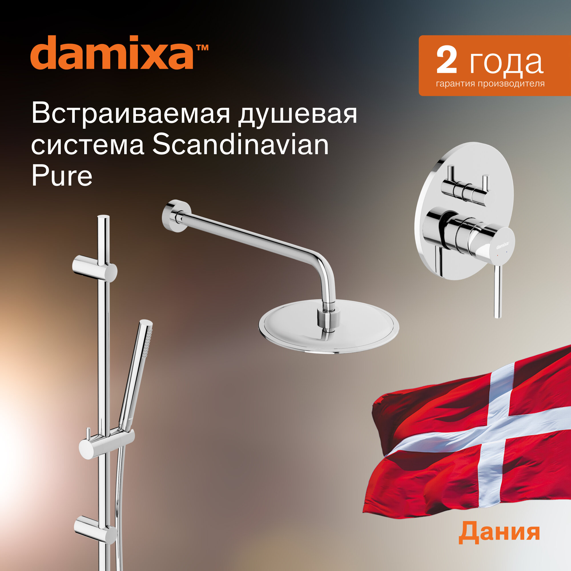 Душевая система с тропическим душем Damixa Scandinavian Pure хром, встраиваемый душевой комплект, штанга информация: