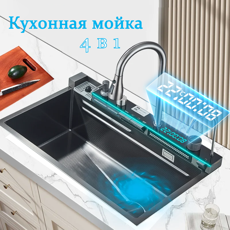 Отзывы на Нержавеющая сталь кухонная мойка с краном цифровым дисплеем большой одной чашей водопадом 4 кнопочной системой раковины