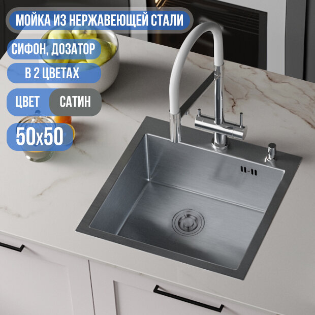 Мойка для кухни врезная из нержавейки с дозатором, сатин, 50x50x21 см информация: