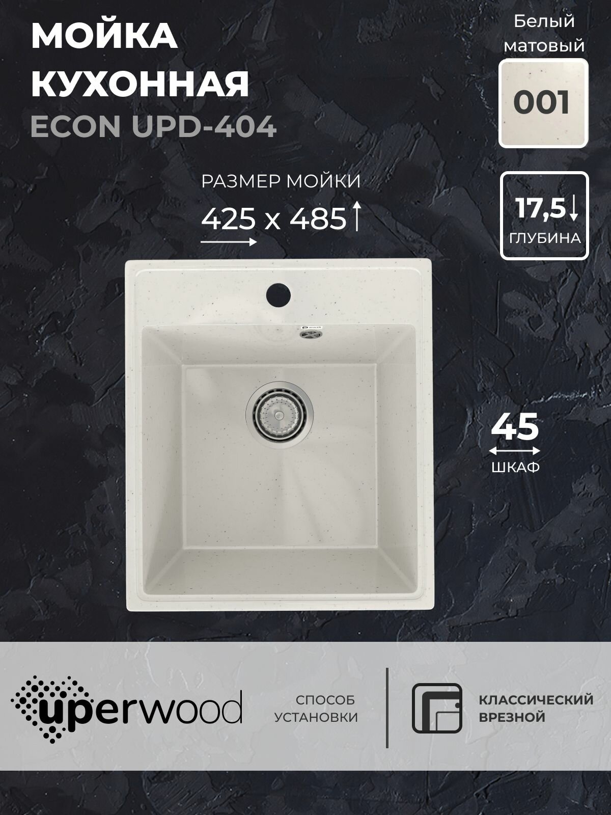 Кухонная мойка из искусственного камня Uperwood ECON UPD-404-001, прямоугольная, белая матовая информация: