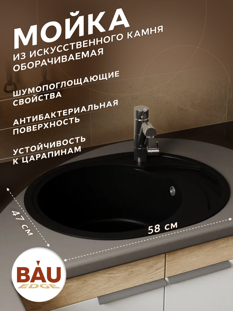 10 цен на Мойка для кухни оборачиваемая овальная BAU Nimb Black coal 58х47, выпуск с сифоном в комплекте, черный уголь