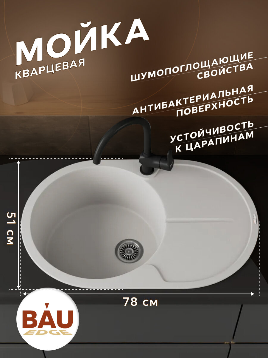 Мойка для кухни врезная кварцевая в комплекте с сифоном BAU Dream Gray silk 78х51, серый шёлк 13 277 ₽