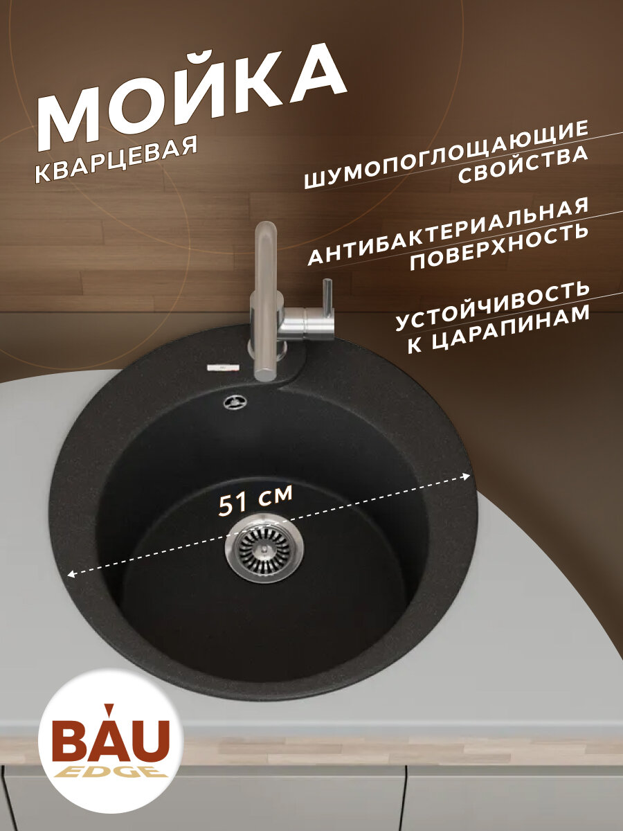 Мойка для кухни врезная кварцевая в комплекте с сифоном BAU Dream Black 51, черный 9 512 ₽
