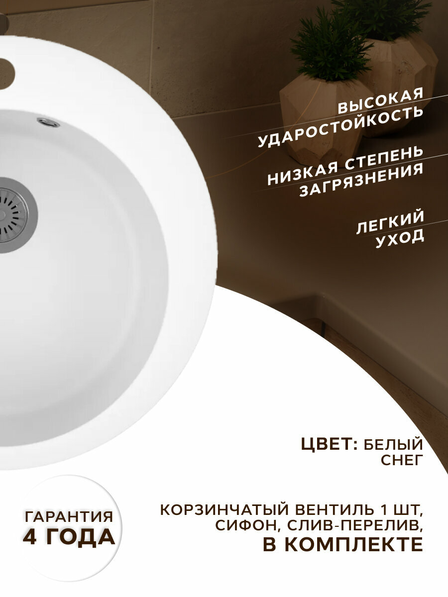 Мойка для кухни BAU Dream White snow D 50, выпуск с сифоном в комплекте, белый снег информация: