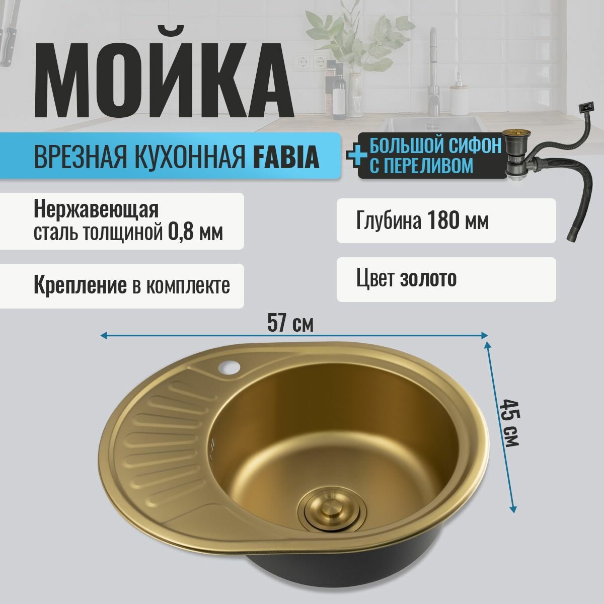 Мойка кухонная FABIA врезная, 57х45, глубина 180 мм, большой сифон с переливом информация: