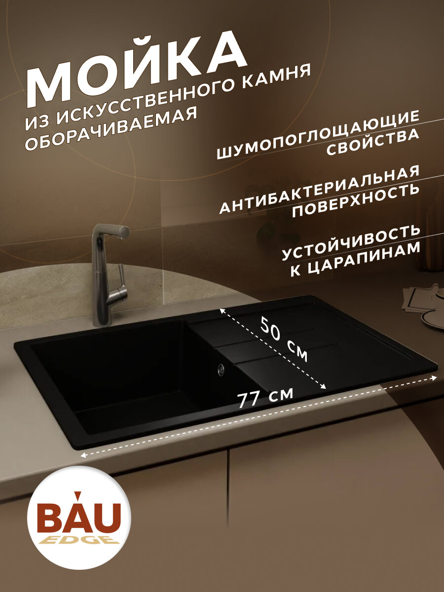 Отзывы на Мойка для кухни оборачиваемая с крылом BAU Stil Black coal 77х50, выпуск с сифоном в комплекте, черный уголь