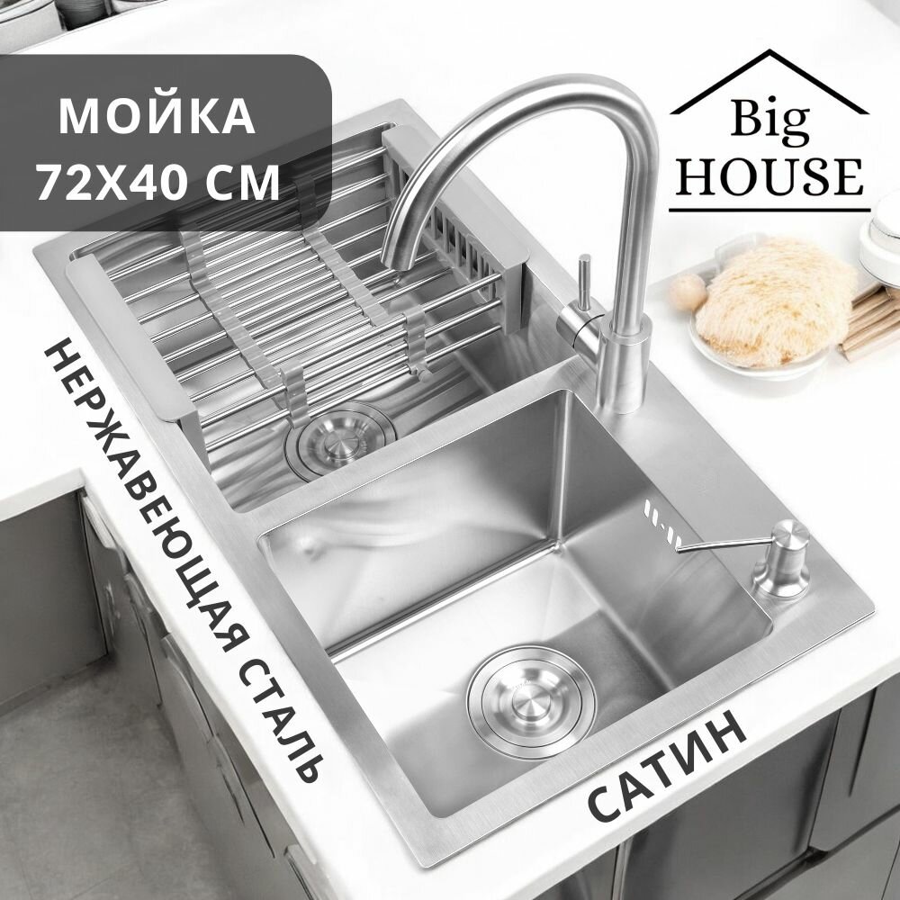 Мойка врезная Big House Двойная 72х40 см, толщина 3,0х0,8 мм, глубина 215 мм, сифон с переливом + коландер + дозатор + смеситель 10 613 ₽