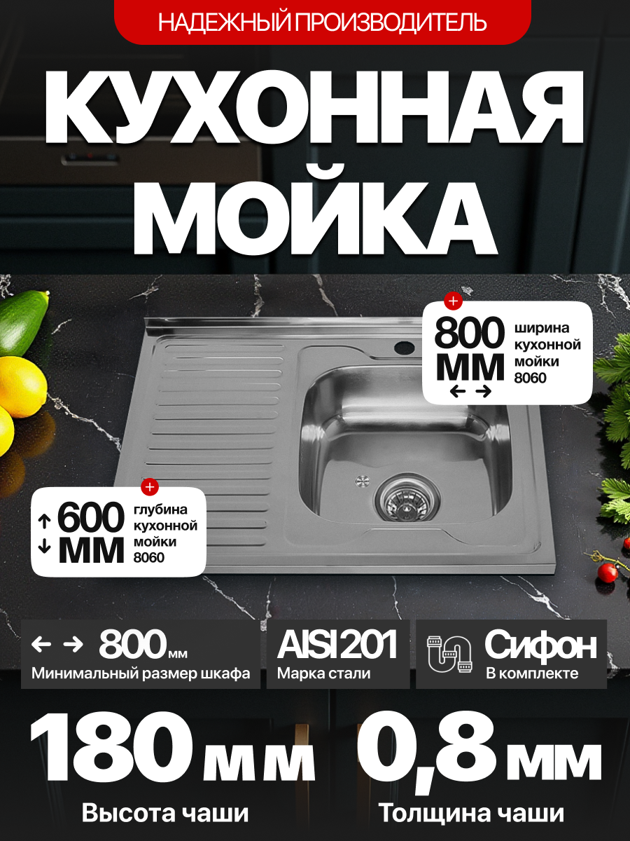 Мойка 8060 R MELANA 0,8/180 накладная прямоугольная с сифоном (007 t R *10) информация: