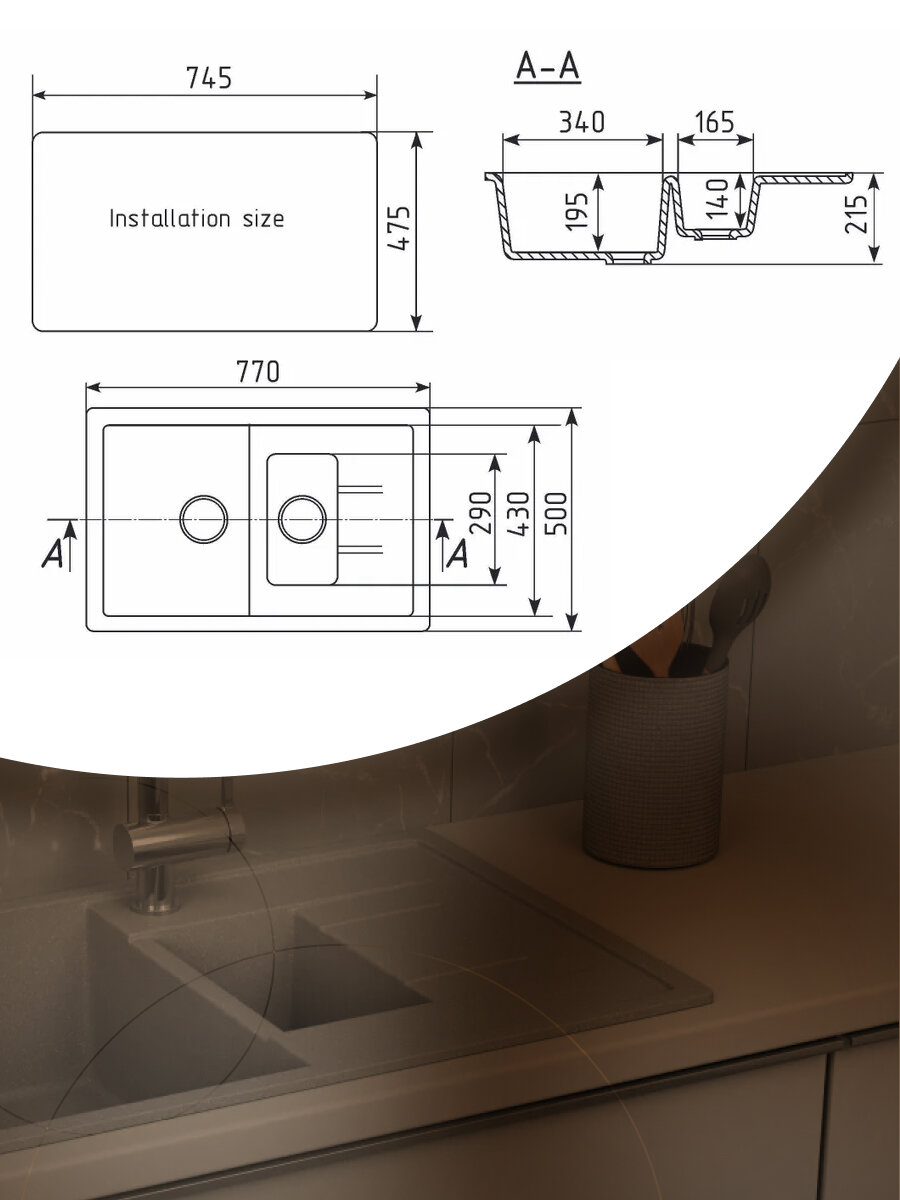 Мойка для кухни BAUEDGE Stil 77x50x21,5 см, с крылом, серый камень, выпуск, сифон информация: